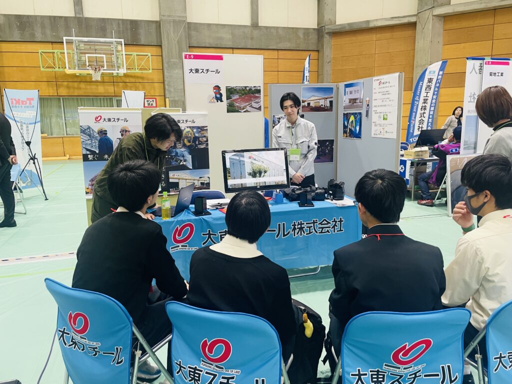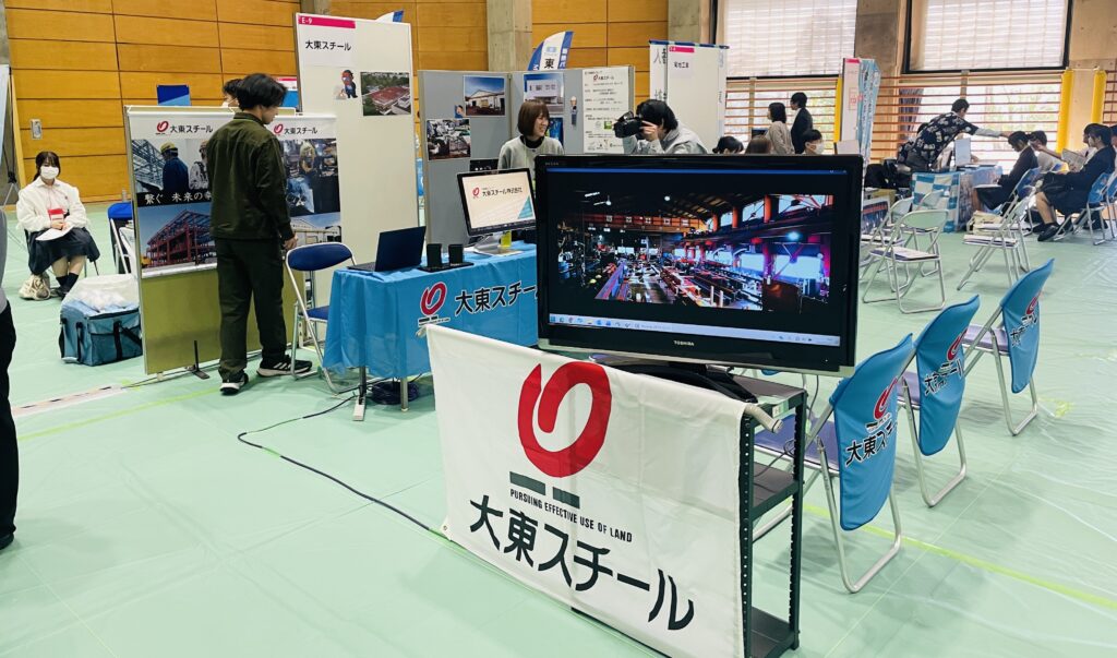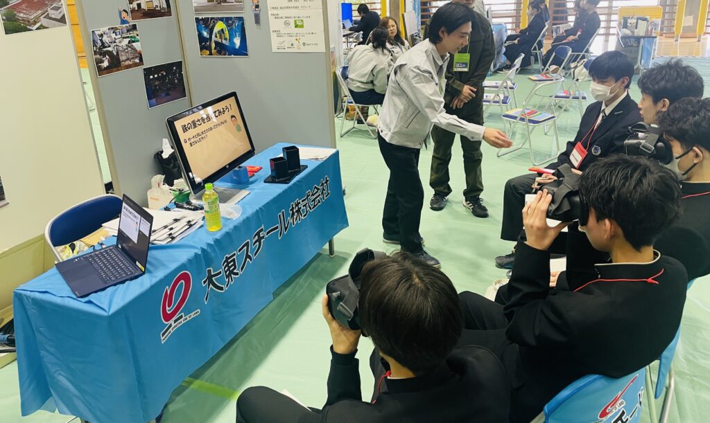 「鉄骨工事バーチャル体験 鉄の職人になってみよう!」として大東スチールのブースを設け、約25人の高校生に鉄骨加工と現場建方の様子を体験して頂きました。